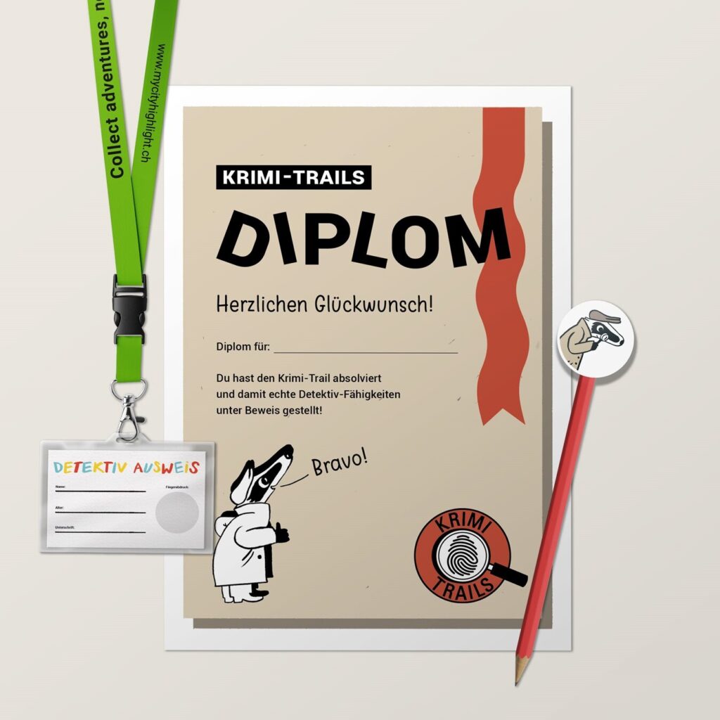 - 1 personalisierbares Detektiv-Diplom, welches nach Absolvierung des Trails an die Kinder abgegeben werden kann.